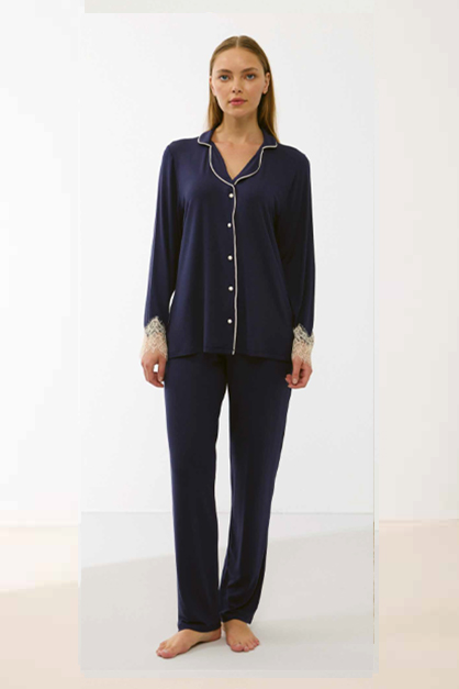 Önden Düğmeli Gömlek Yaka Lacivert Pijama Takım